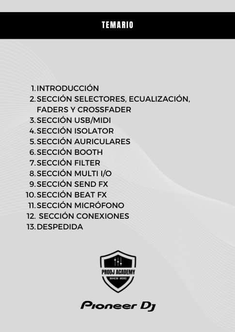 Desde el uso del mixer, decks uso básico de rekordbox hasta el manejo de lo Smart Cue, conexiones, Smooth Echo, y todas las funciones de este potente todo en uno profesional.